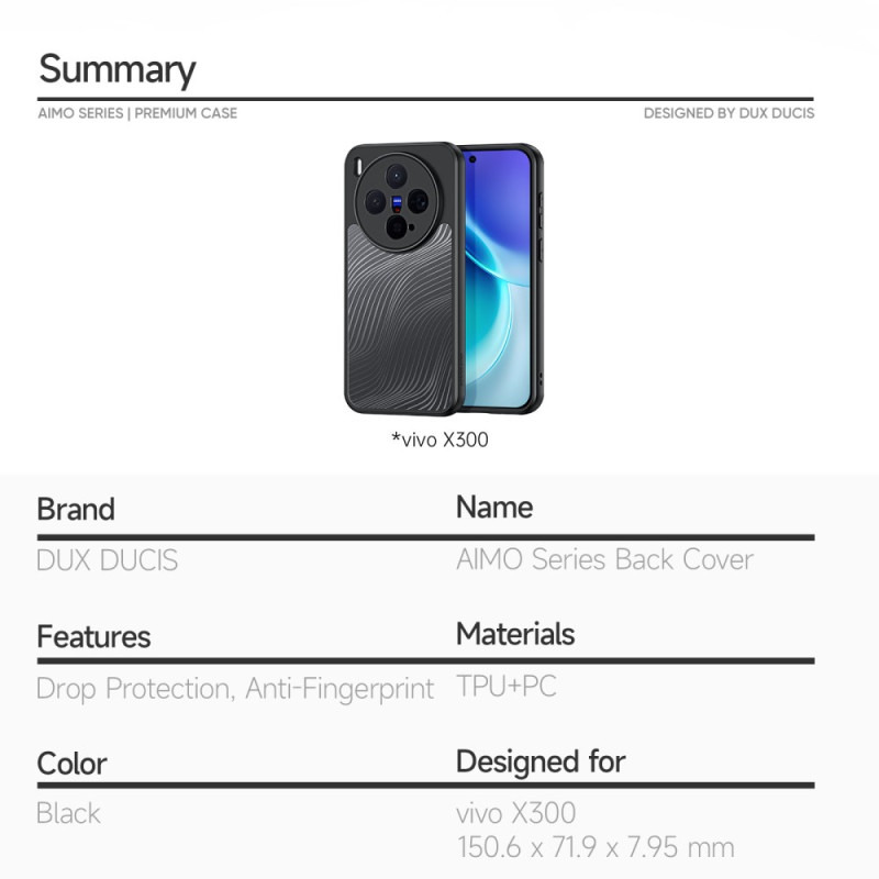 Protégez votre vivo X300 5G avec style grâce à la coque DUX DUCIS Aimo. Alliant robustesse et élégance, cette coque antichoc offre une prise en main confortable et une protection optimale contre les chutes jusqu'à 1,2m (certifié SGS)...