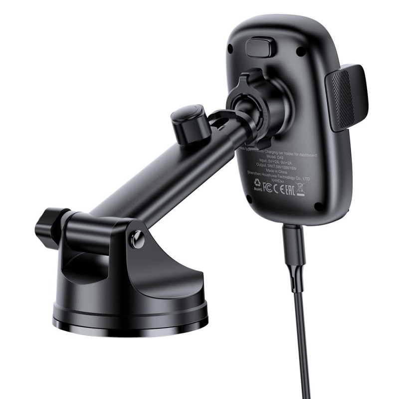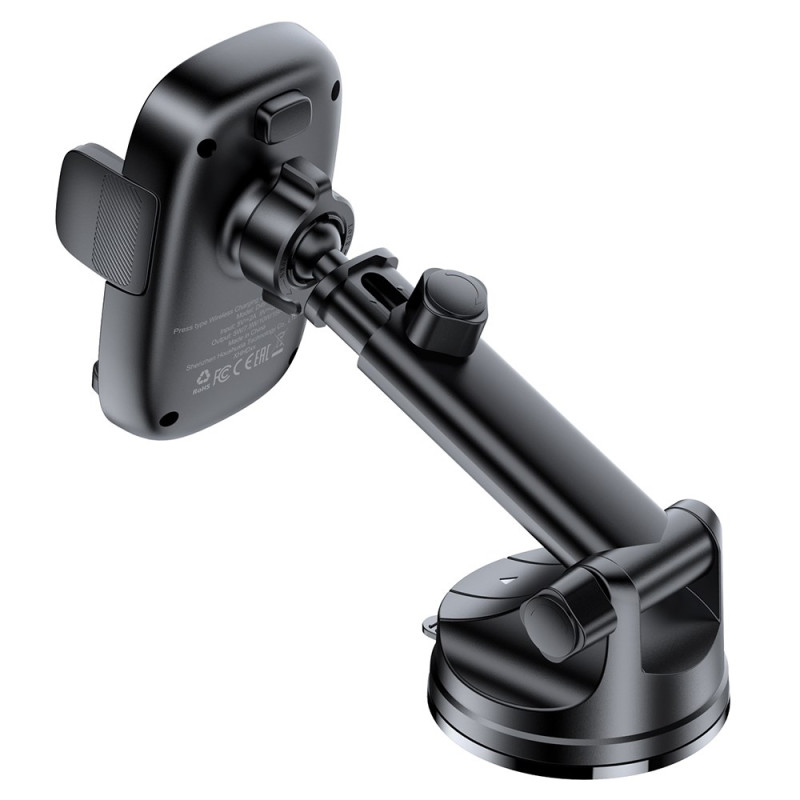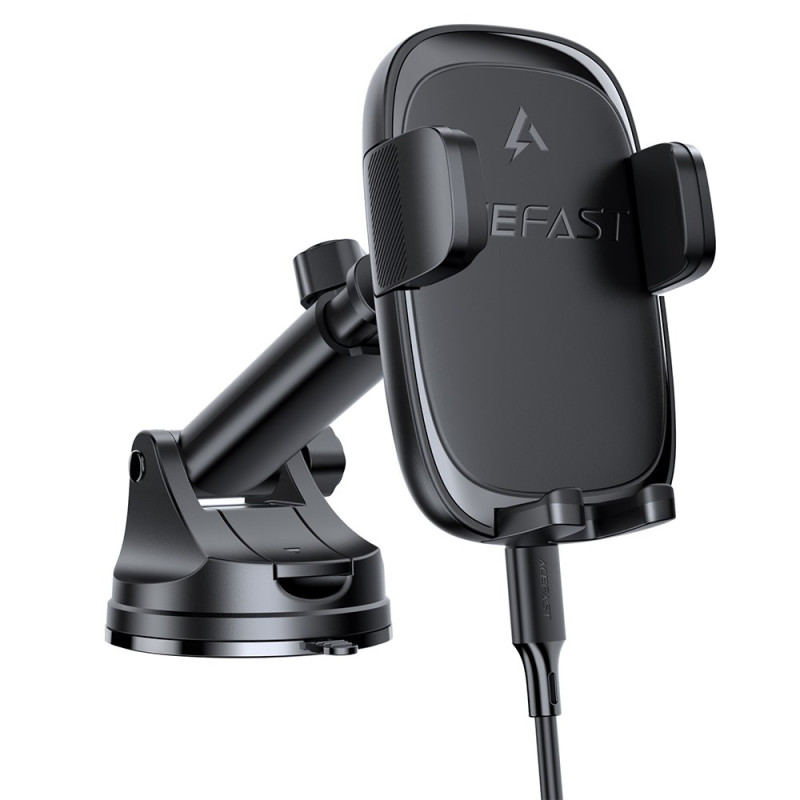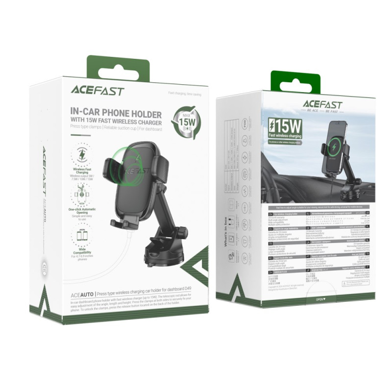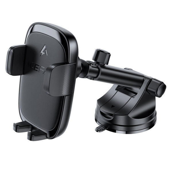 ACEFAST draadloze autohouder met 15W snellaadfunctie. Veilig mechanisch sluitsysteem en herpositioneerbare zuignap. Compatibel met alle smartphones van 4,7 tot 6,9 inch. Flexibele installatie op dashboard of voorruit.
