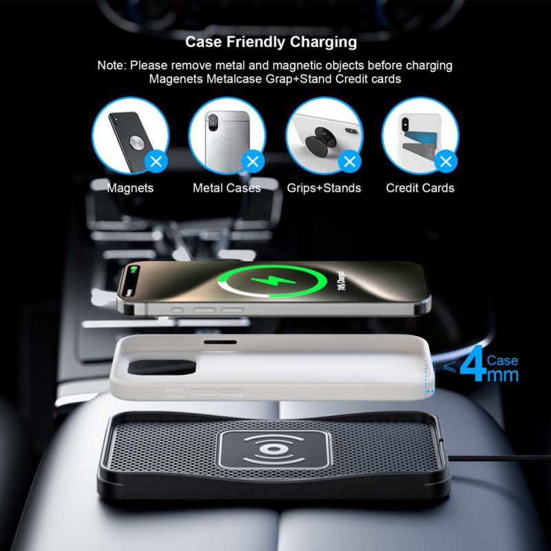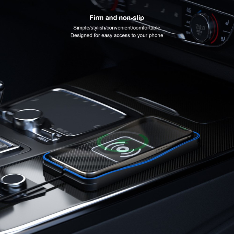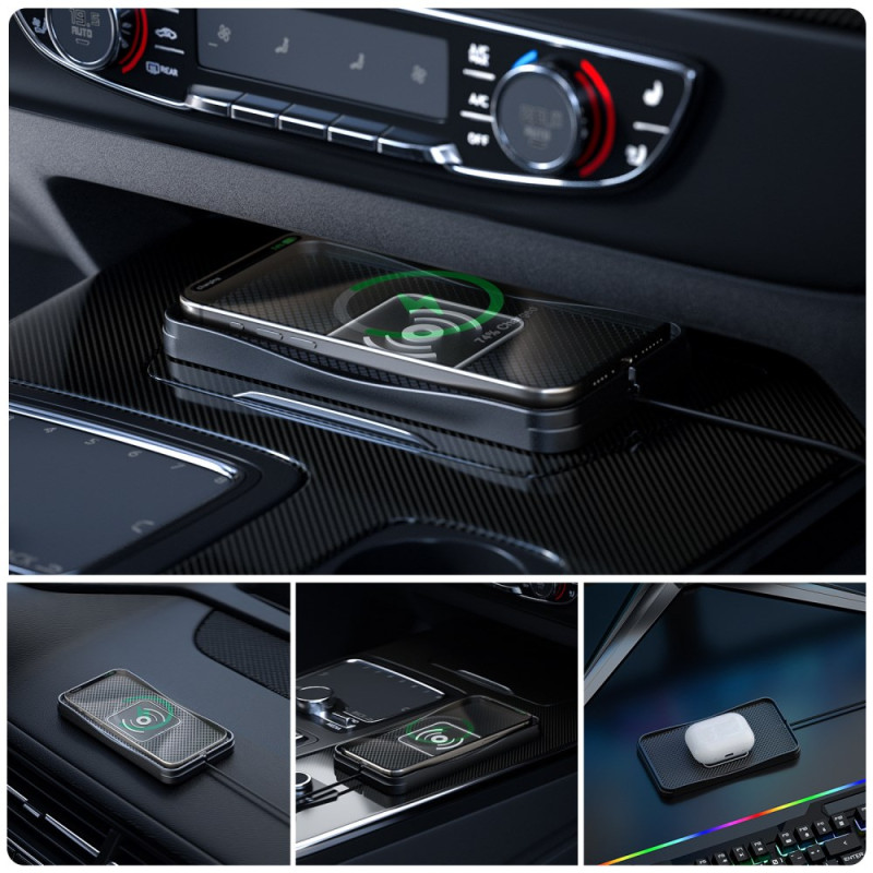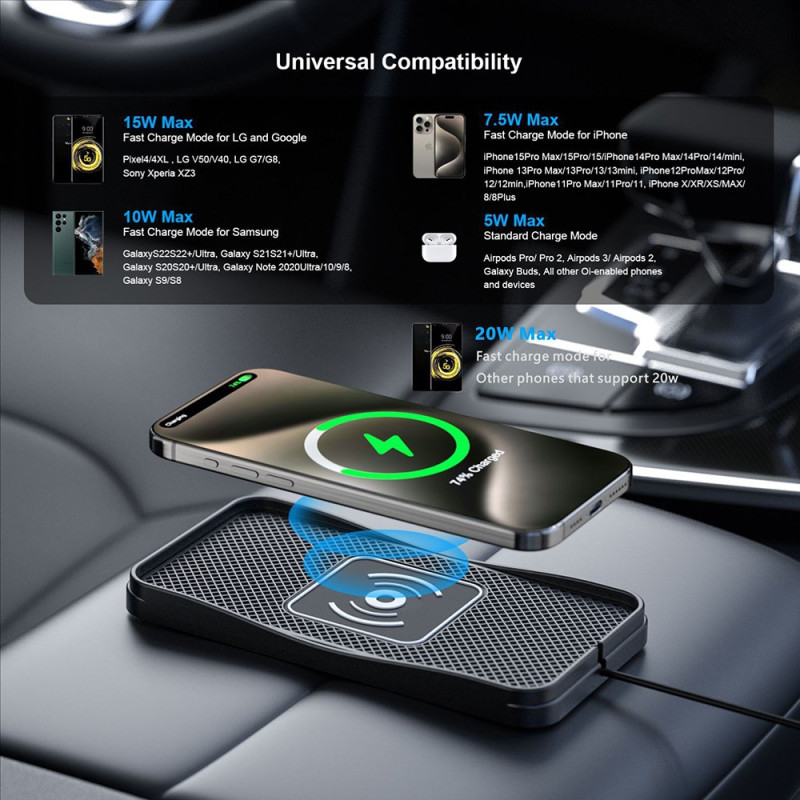 Draadloze autolader voor snel opladen tot 20 W. Voorzien van een antislip siliconen pad om je telefoon veilig te houden tijdens het rijden. Eenvoudig te installeren zonder het voertuig aan te passen, met een kabel van 1 meter.
