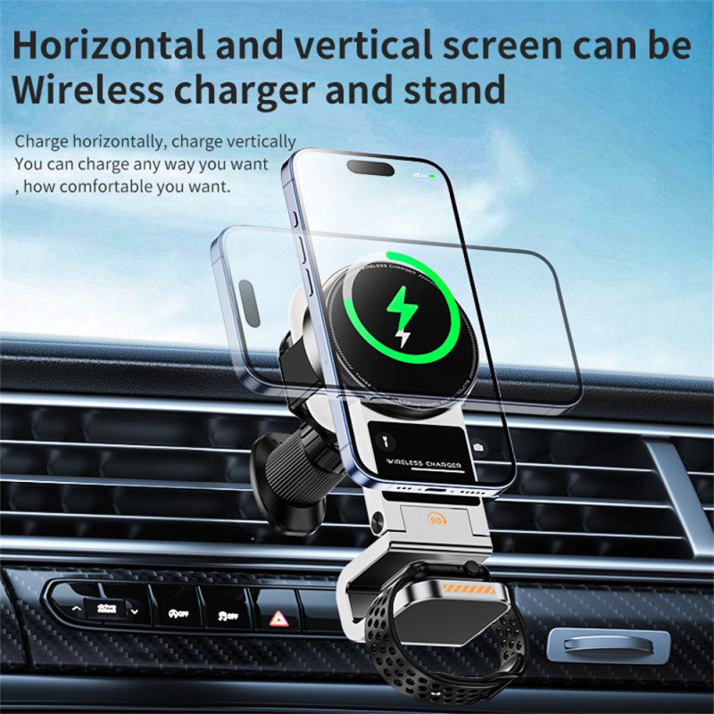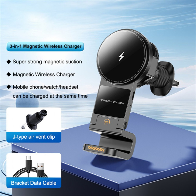 Transformeer je reis met deze innovatieve magnetische houder die tegelijkertijd je telefoon, horloge en koptelefoon oplaadt. Geniet van snel opladen met 15 W en veilige installatie op een ventilatierooster voor verbonden rijden.