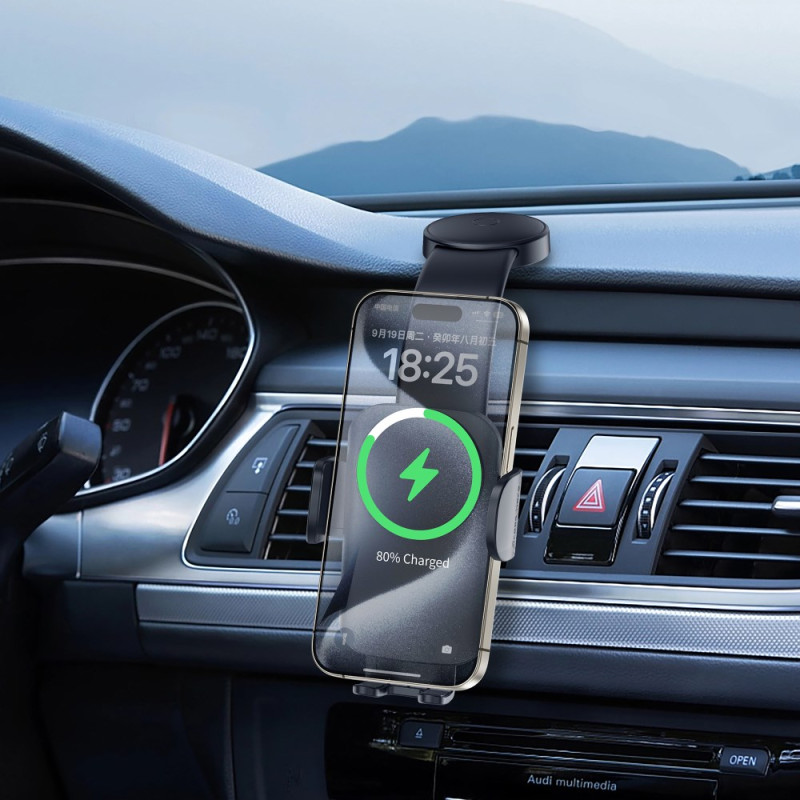 Ontdek de WIWU CH-322 autohouder: een ultrasnelle 15W draadloze oplader met intelligente automatische klemming. Plaats gewoon je telefoon en laat de armen automatisch sluiten voor een stevige grip. De stevige zelfklevende basis past zich aan alle gladde dashboards aan. Het ergonomische ontwerp belemmert je zicht of de oplaadpoort van je telefoon niet.