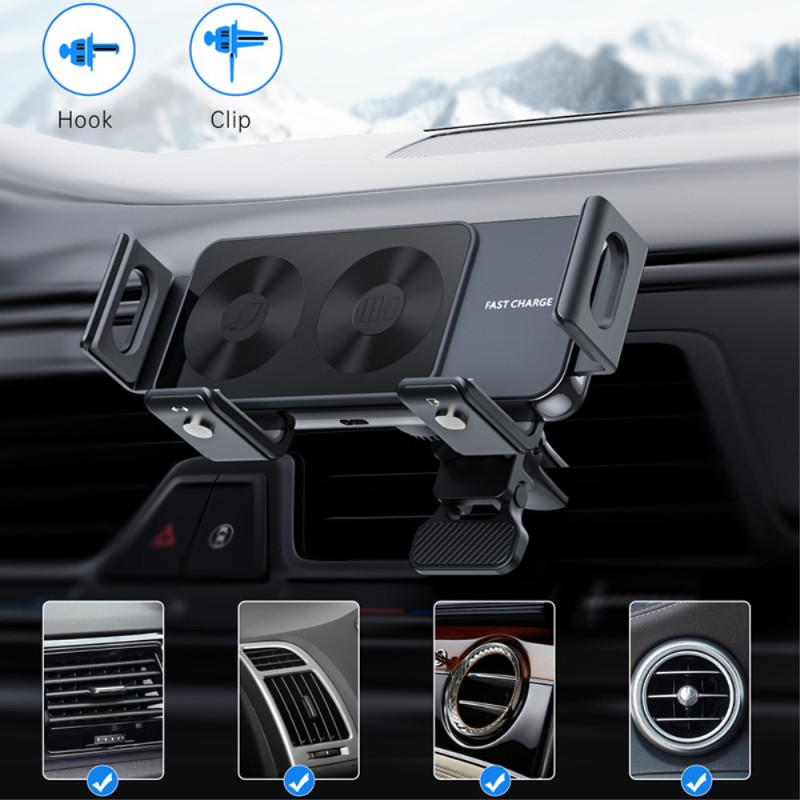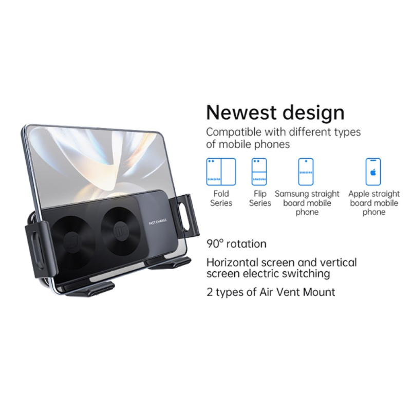 Autohouder met slimme draadloze oplader speciaal ontworpen voor Samsung opvouwbare smartphones. Automatische rotatie van 90 graden en dubbele spoel voor optimaal opladen in horizontale of verticale positie.