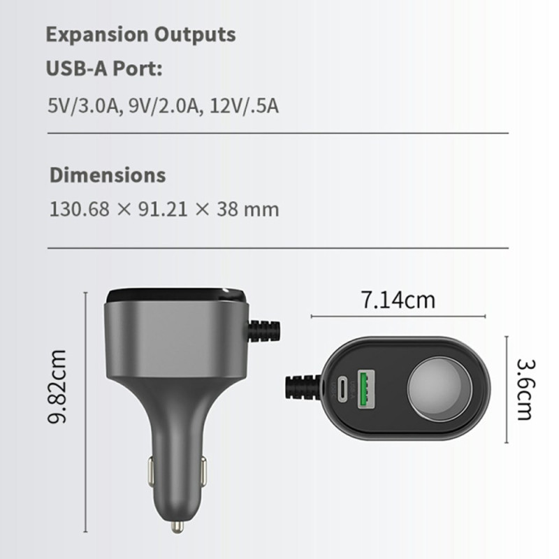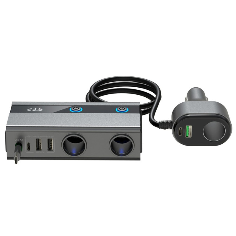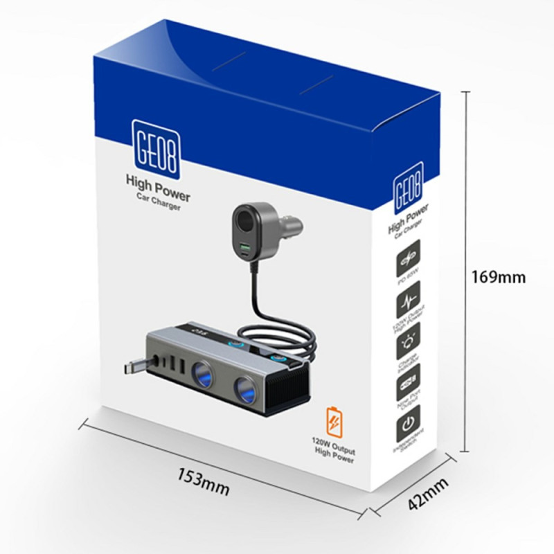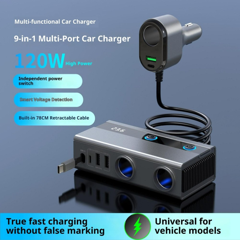 9-in-1 120W multi-poort autolader met 78cm intrekbare kabel en 65W PD snellader. Dubbele schakelaars voor nauwkeurige stroomregeling. Compatibel met alle 12V-24V voertuigen.