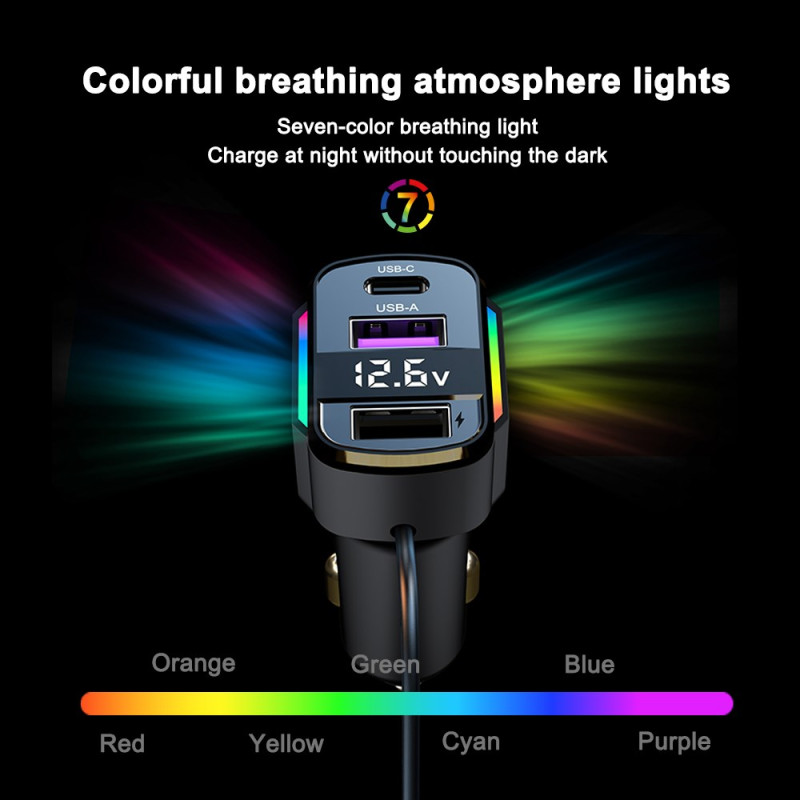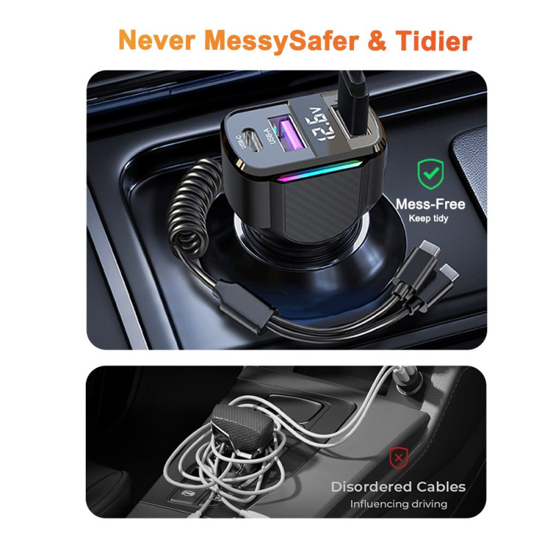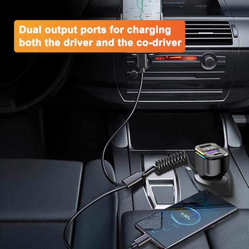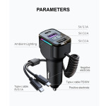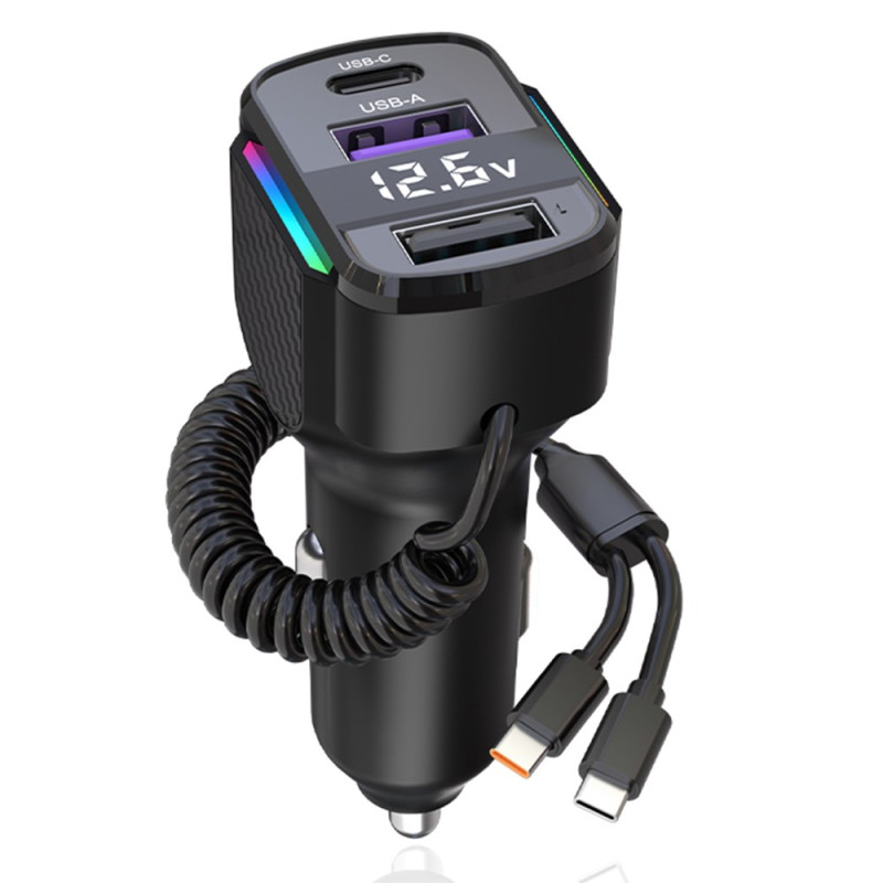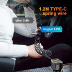 Krachtige autolader met 30W PD snellaadfunctie en 1,2 m Type-C spiraalkabel. Gekleurd LED-licht voor gemakkelijke locatie in het donker. Compatibel met al je apparaten: iPhone, Samsung, Xiaomi, Huawei en tablets.