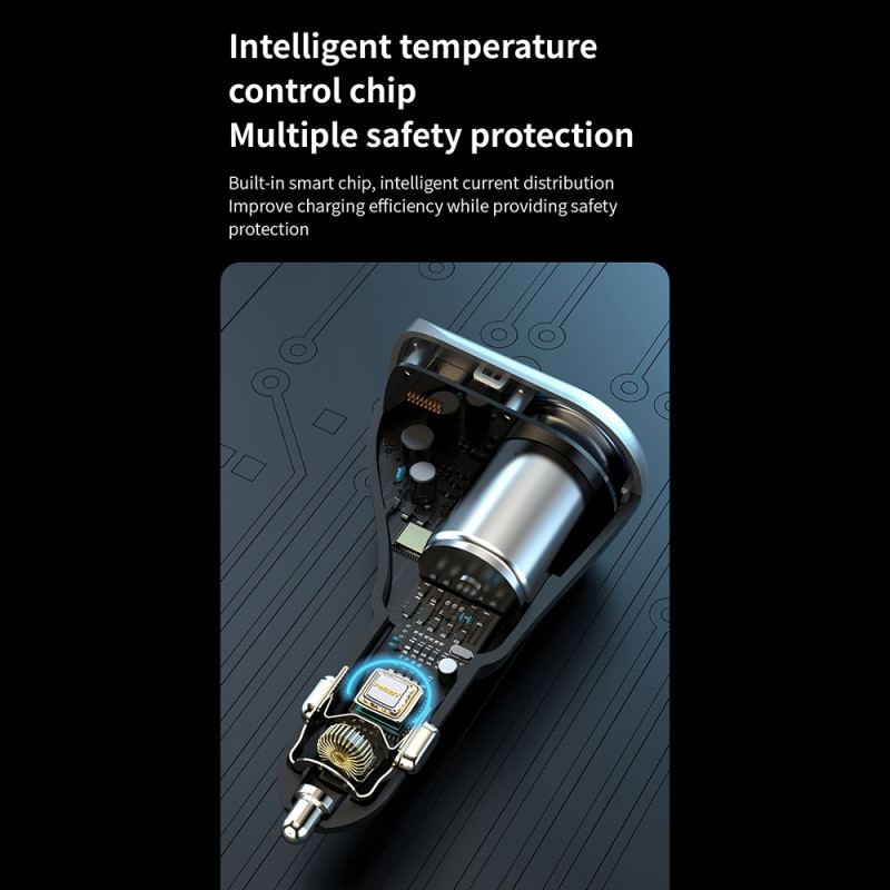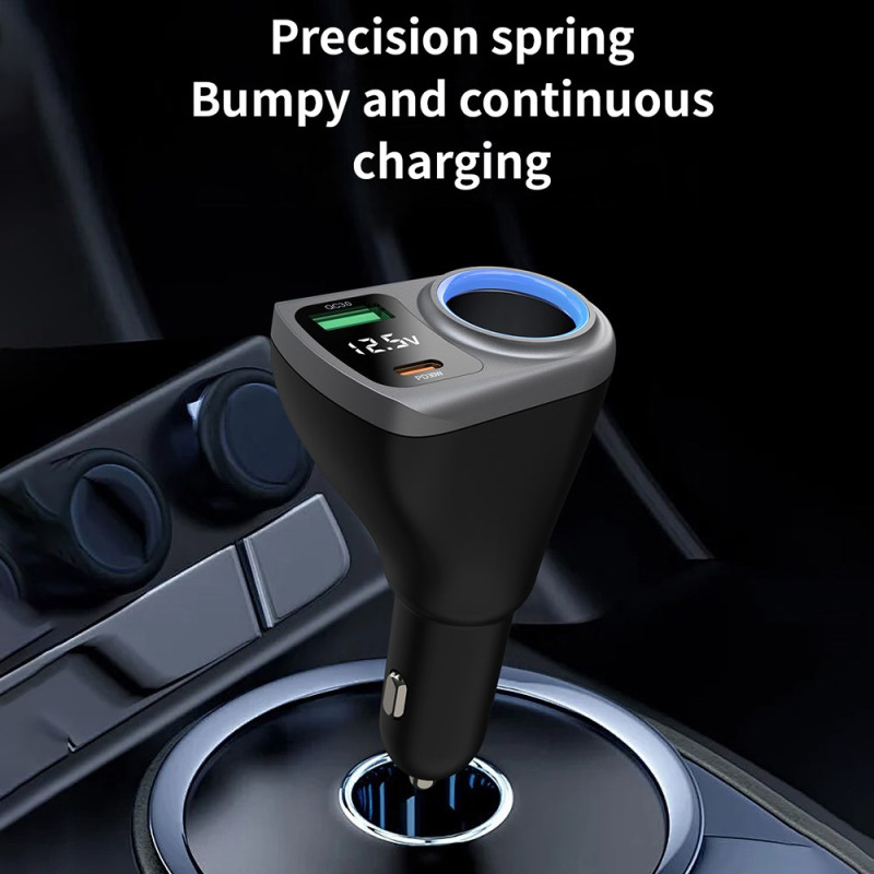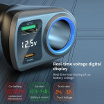 Intelligente 3-in-1 sigarettenaanstekeroplader met real-time digitale spanningsweergave. Biedt snel PD 30W opladen via Type-C poort, USB QC 3.0 18W poort en sigarettenaanstekeraansluiting om meerdere apparaten tegelijk op te laden.