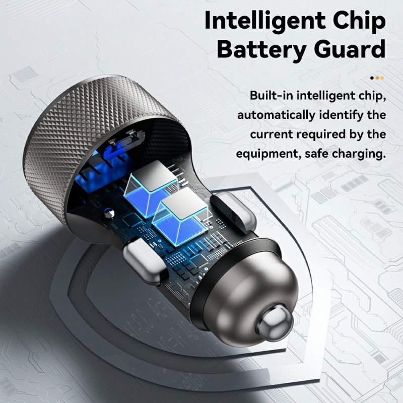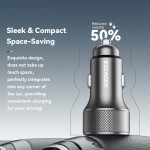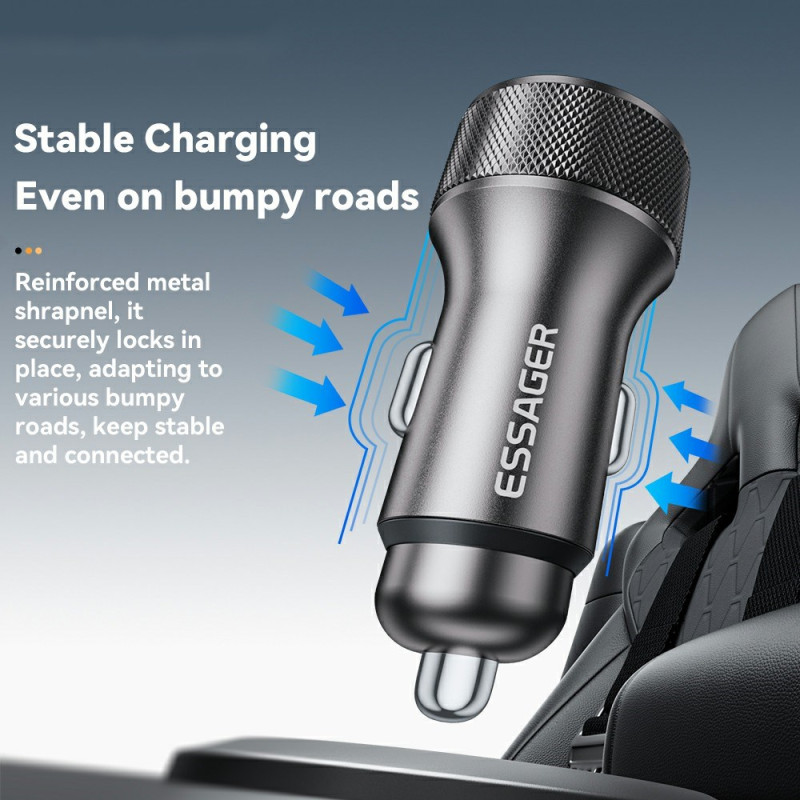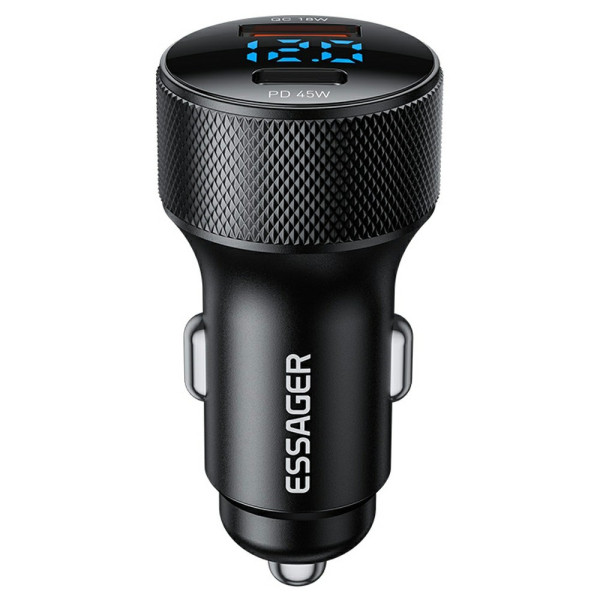 ESSAGER snelle autolader met dubbele USB-A en Type-C poorten die tot 45W vermogen bieden. Compatibel met PD3.0 en QC3.0 voor het ultrasnel opladen van je apparaten. Real-time LED-vermogensweergave en slimme chip voor optimale bescherming.