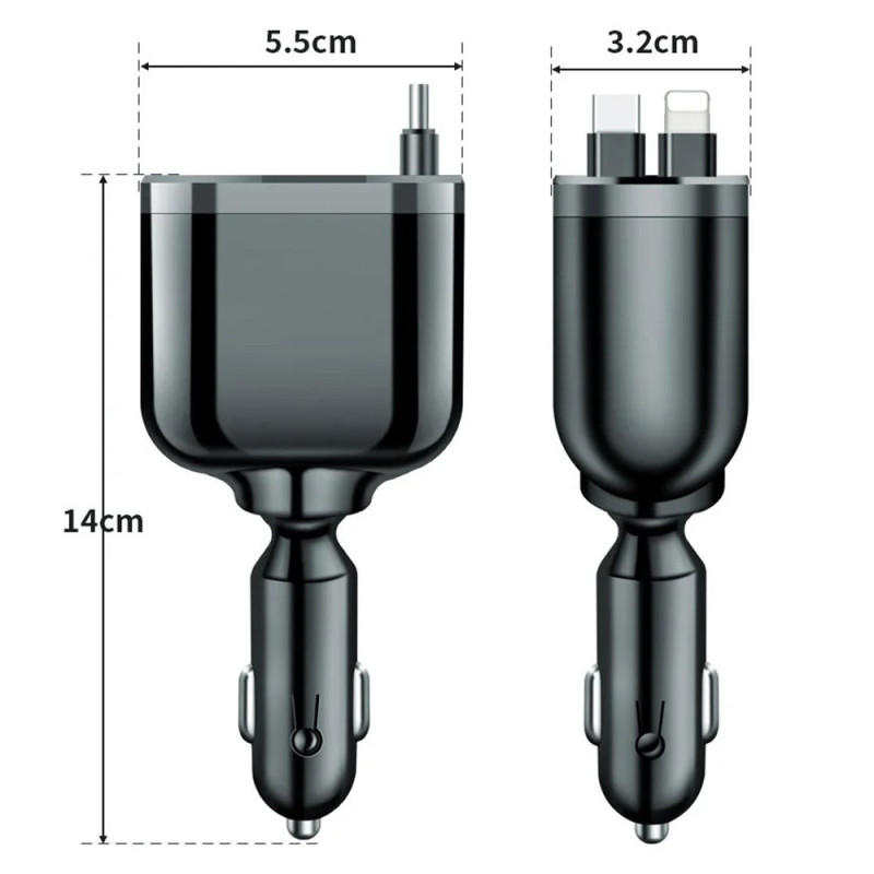 Krachtige 5-in-1 autolader met intelligent digitaal display. Laad tot 5 apparaten tegelijk op dankzij de snellaad USB- en Type-C-poorten. Geïntegreerde intrekbare kabels voor iPhone en Type-C apparaten.