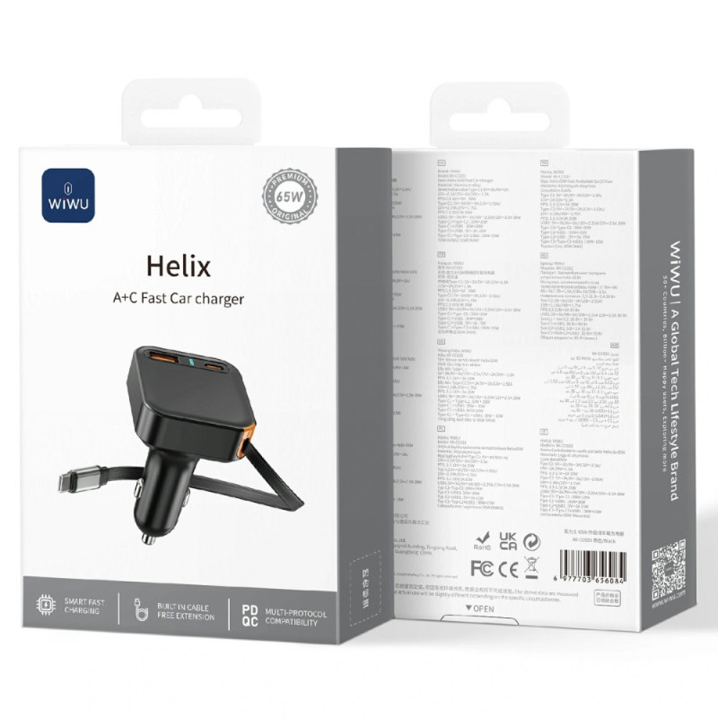 Snelle 65W autolader met dubbele USB-A en USB-C poorten, inclusief een 60cm intrekbare Type-C kabel. Compatibel met PD- en PPS-protocollen voor ultrasnel opladen van al je apparaten. Intelligente stroomverdelingstechnologie en geavanceerd koelsysteem.