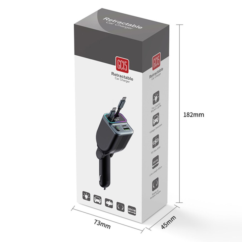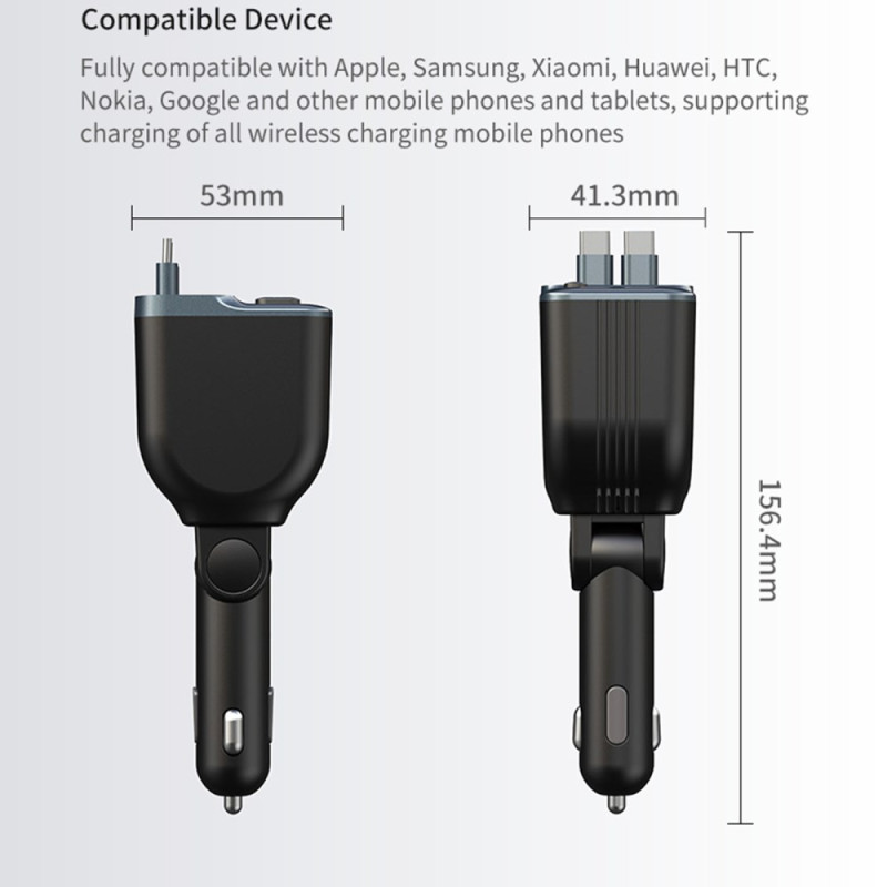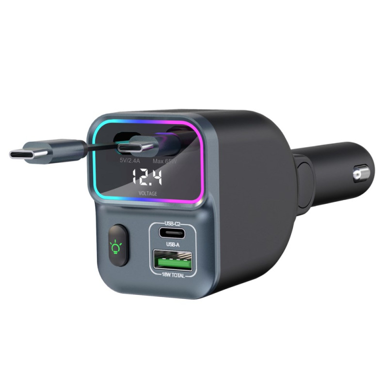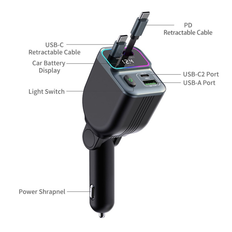 Hoogwaardige autolader met dubbele ingebouwde intrekbare USB-C-kabels en realtime spanningsmonitor. 83W gecombineerd vermogen voor het snel gelijktijdig opladen van je apparaten. Compatibel met alle 12V/24V smartphones en voertuigen.