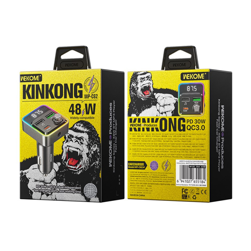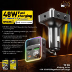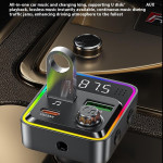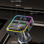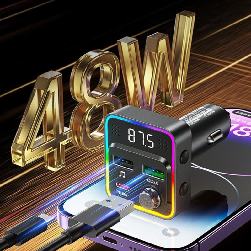 Intelligente 48 W autolader met dubbele snellaadpoorten (PD30W + QC3.0), geïntegreerde MP3-speler en 7-kleuren sfeerverlichting. Geniet van handsfree Bluetooth-gesprekken en optimaal opladen van al je apparaten. Geschikt voor 12V-24V.