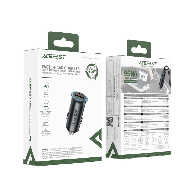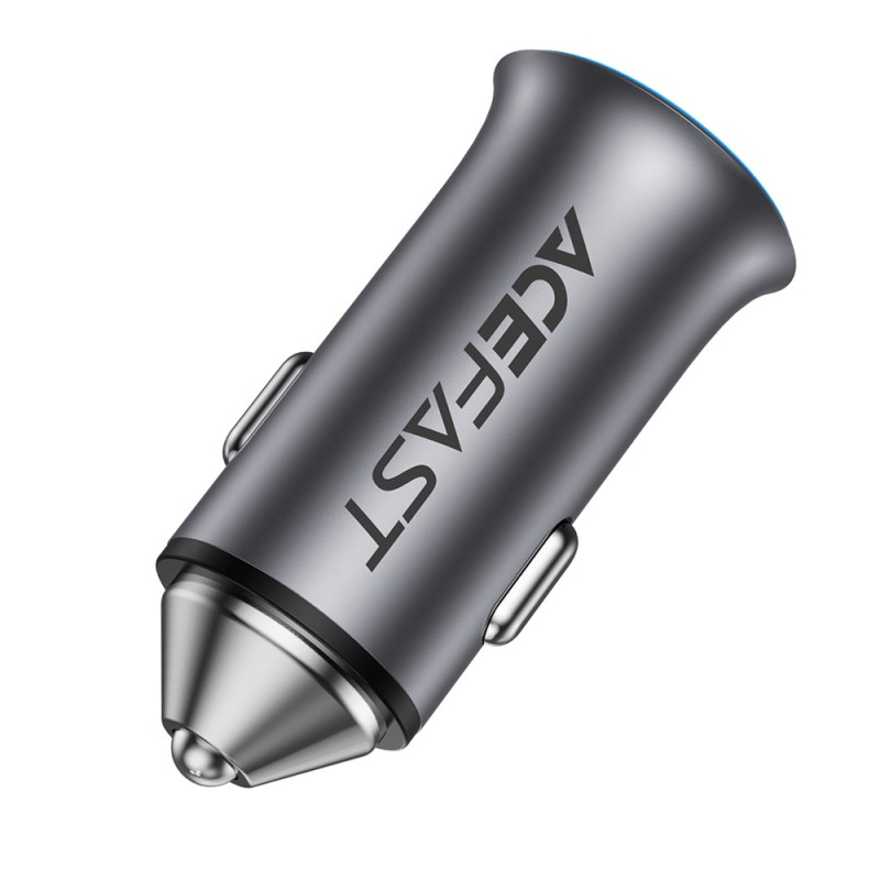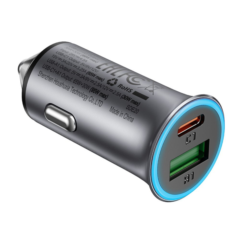 Ultra-krachtige autolader met twee poorten en een gecombineerd vermogen tot 95 W. Geniet van snel gelijktijdig opladen via USB-C (65W) en USB-A (30W). Compact, stijlvol ontwerp met ijsblauwe lichtring voor een vleugje sfeer.
