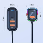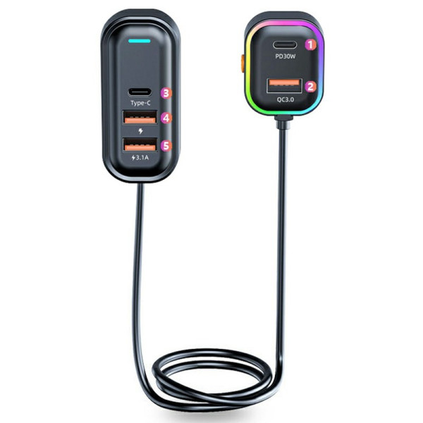 Verander je auto in een veelzijdig oplaadstation! Deze lader met meerdere poorten biedt snel 30W PD en QC 3.0 opladen voor al je apparaten. Met zijn verlengkabel van 1 m en stijlvolle sfeerverlichting kun je tot 5 apparaten tegelijk opladen vanaf de voor- en achterbank.