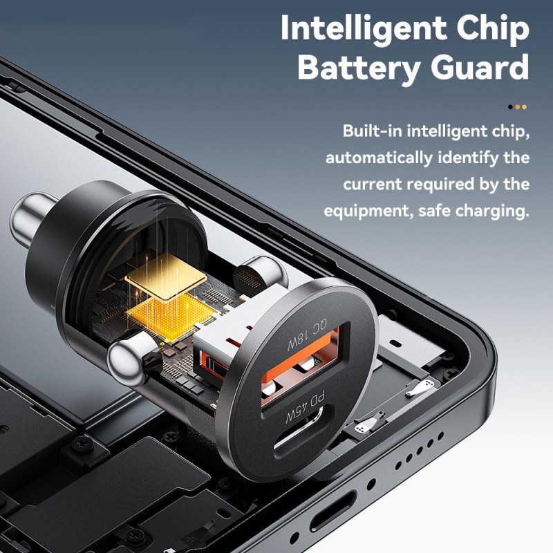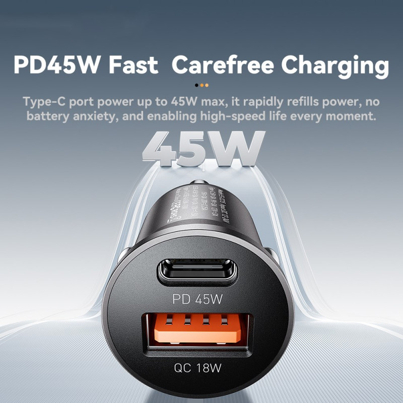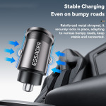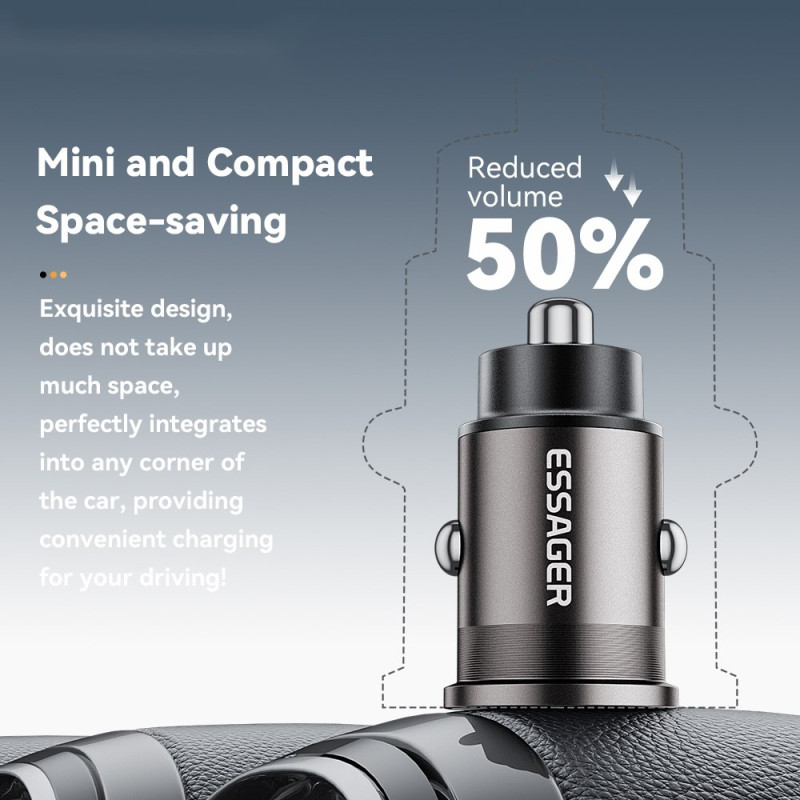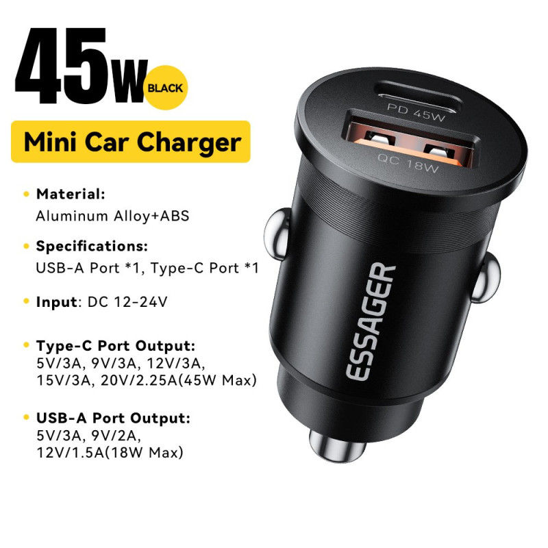 ESSAGER 45W autolader met PD en QC snellaadtechnologie. Dubbele USB-A en Type-C poorten voor gelijktijdig opladen van twee apparaten. Ultracompact ontwerp (10 g) met slimme chip voor optimaal en veilig opladen. Compatibel met alle 12-24V voertuigen.