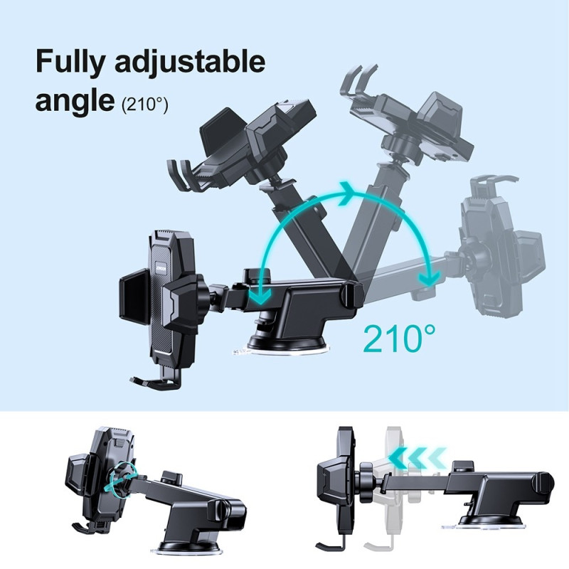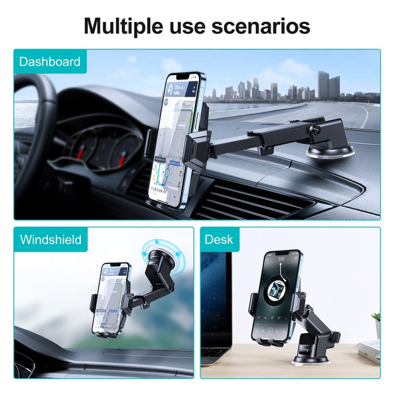 Ultra-veelzijdige autohouder met zuignap en 360° verstelbare hoek. Compatibel met 4" tot 7" smartphones. Universele installatie op dashboard, voorruit of ventilatierooster voor veilig rijden.