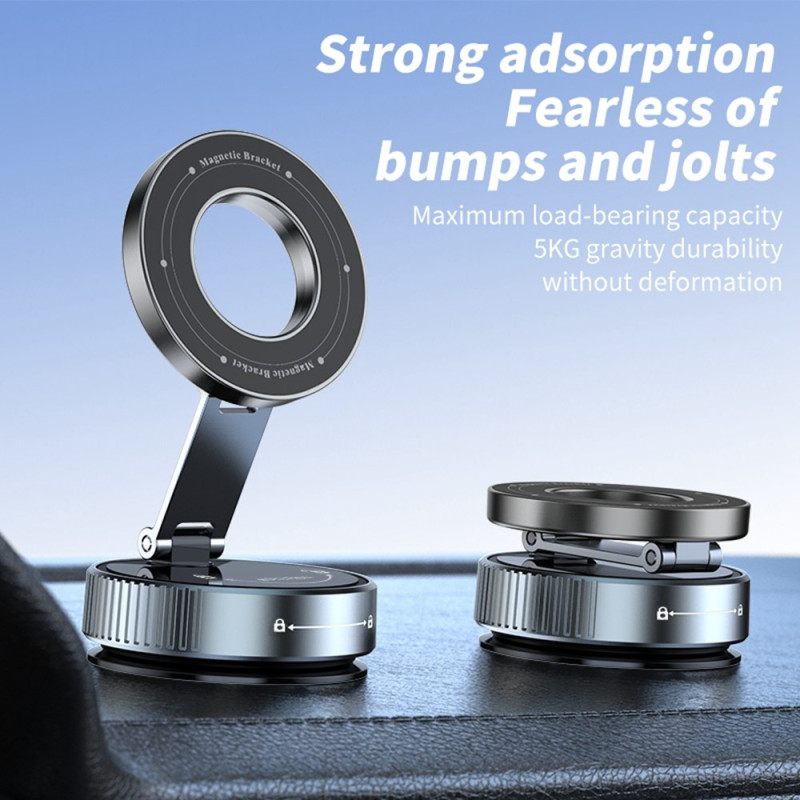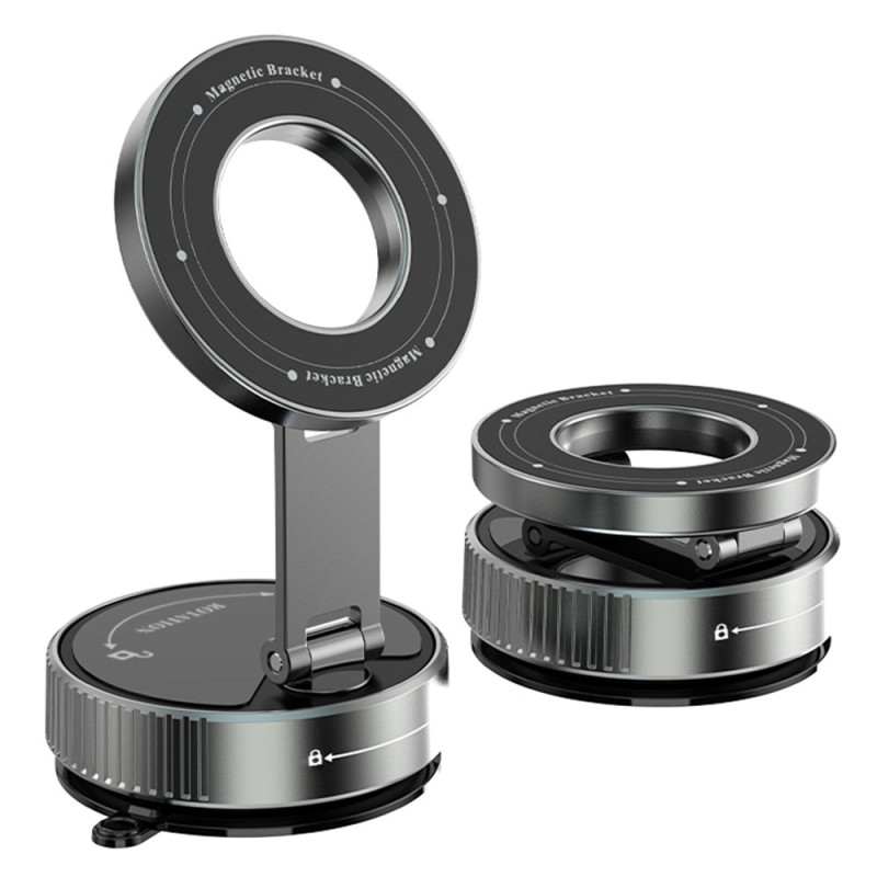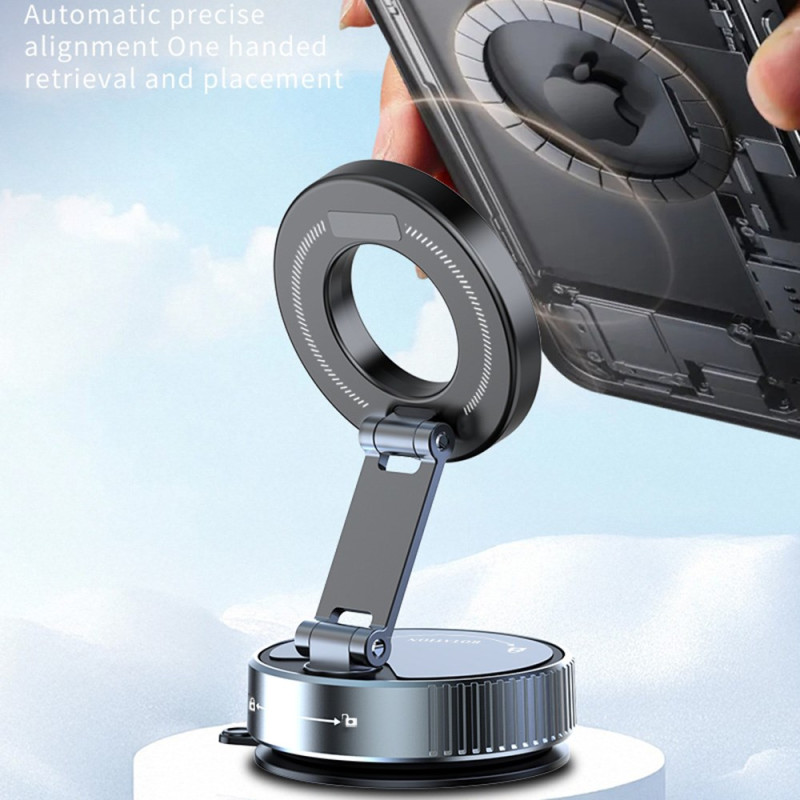 Universele magnetische autohouder met ultra hechtende zuignap en 360° rotatie. Geniet van optimale navigatie dankzij de verstelbare arm en krachtige magnetische aantrekkingskracht van 20N. Eenvoudige installatie zonder gereedschap, compatibel met alle smartphones die zijn uitgerust met magnetisch draadloos opladen.