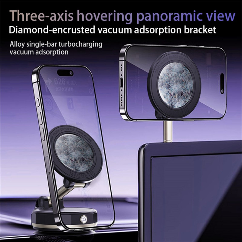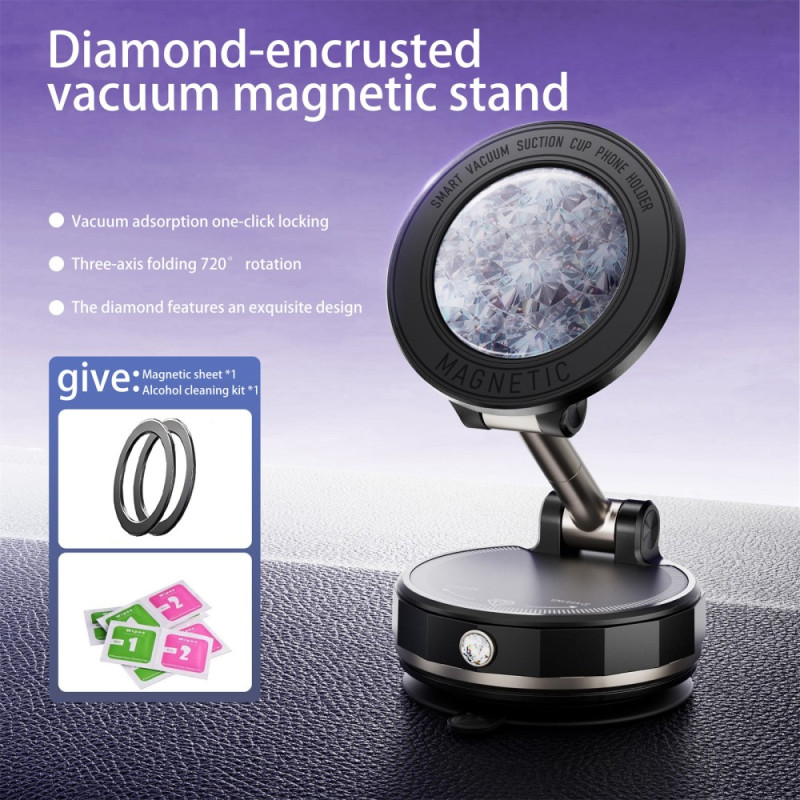 Opvouwbare magnetische autotelefoonhouder met elegant ontwerp van epoxyhars en strassteentjes. Voorzien van 17 ultrakrachtige N52 magneten voor veilige bevestiging tijdens het rijden. Vacuümzuignap voor installatie op dashboard of voorruit.