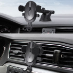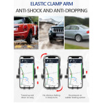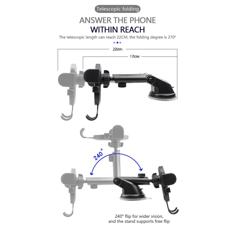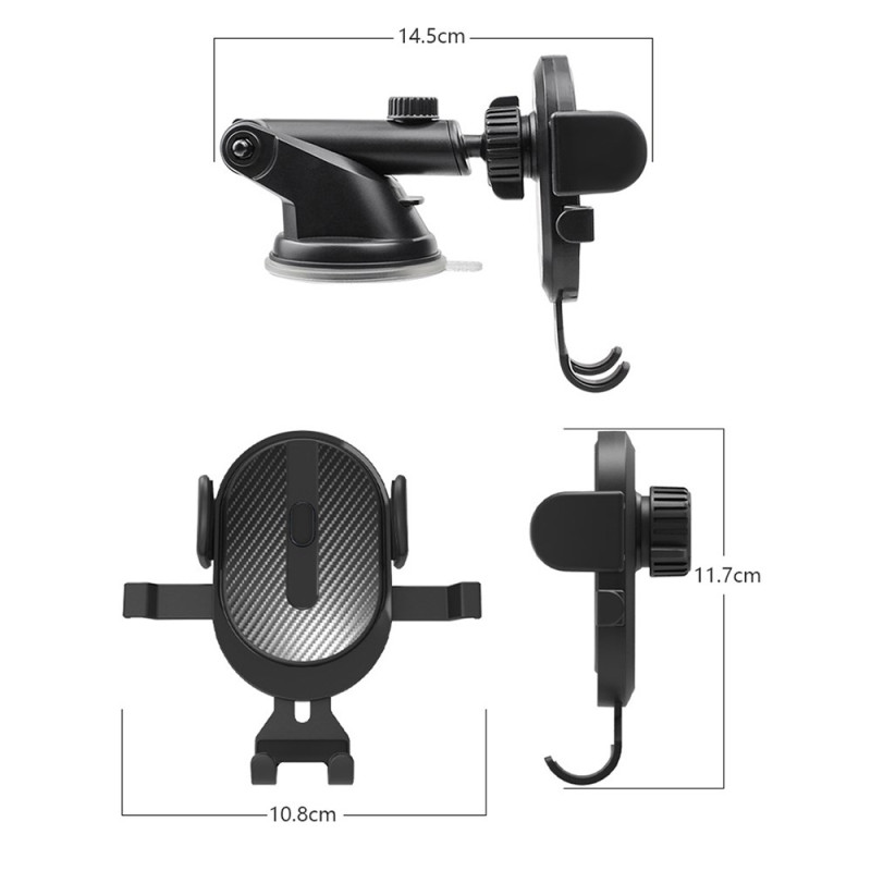 Universele houder voor autotelefoon met automatische zwaartekrachtvergrendeling. Zuignapbevestiging op voorruit of dashboard. Stabiele driehoekige structuur, 360° draaibaar, verstelbare telescopische arm. Compatibel met smartphones van 64 mm tot 91 mm.
