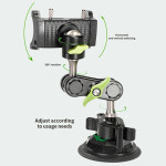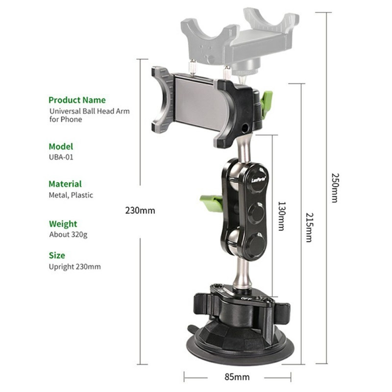 De LANPARTE UBA-01 universele zuignap autohouder biedt een stabiele en veelzijdige houvast voor smartphones en kleine camera's. Dankzij de krachtige zuignap hecht hij stevig aan het dashboard of de voorruit en garandeert optimale stabiliteit tijdens het rijden. Dankzij de scharnierende arm kun je hem op meerdere manieren verstellen om in de perfecte hoek te filmen of te navigeren. Hij is gemaakt van hoogwaardig aluminium, ABS en siliconen en combineert robuustheid met flexibiliteit. Compatibel met camera's van 6,5 tot 8 cm breed en tot 1 cm dik, kan het worden gebruikt voor zowel reizen als buiten filmen.