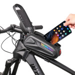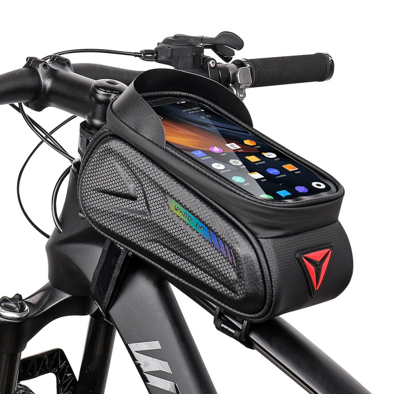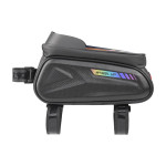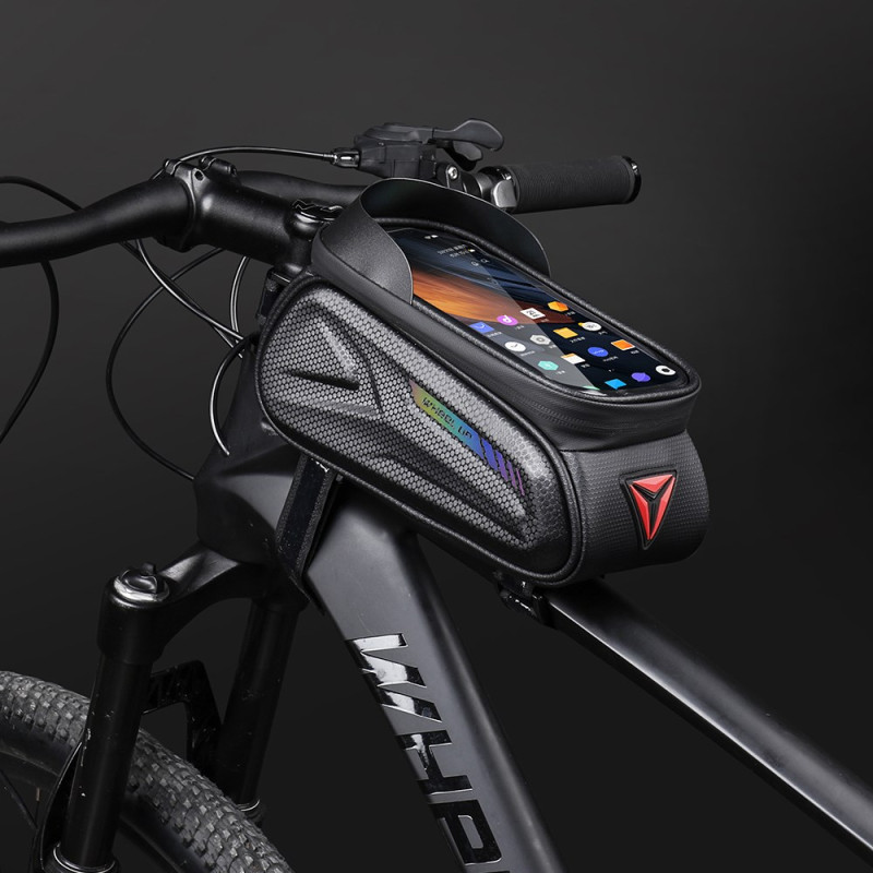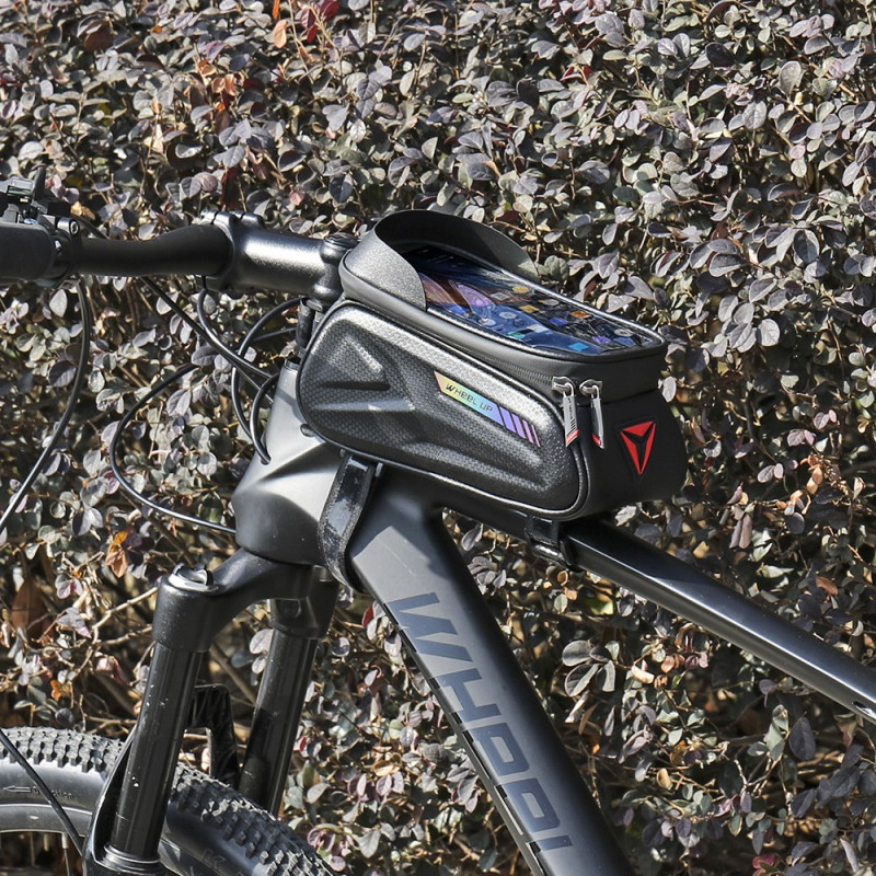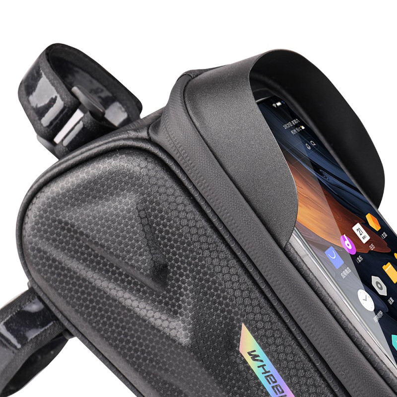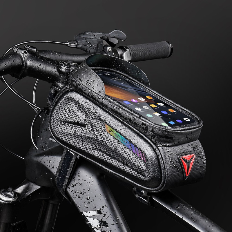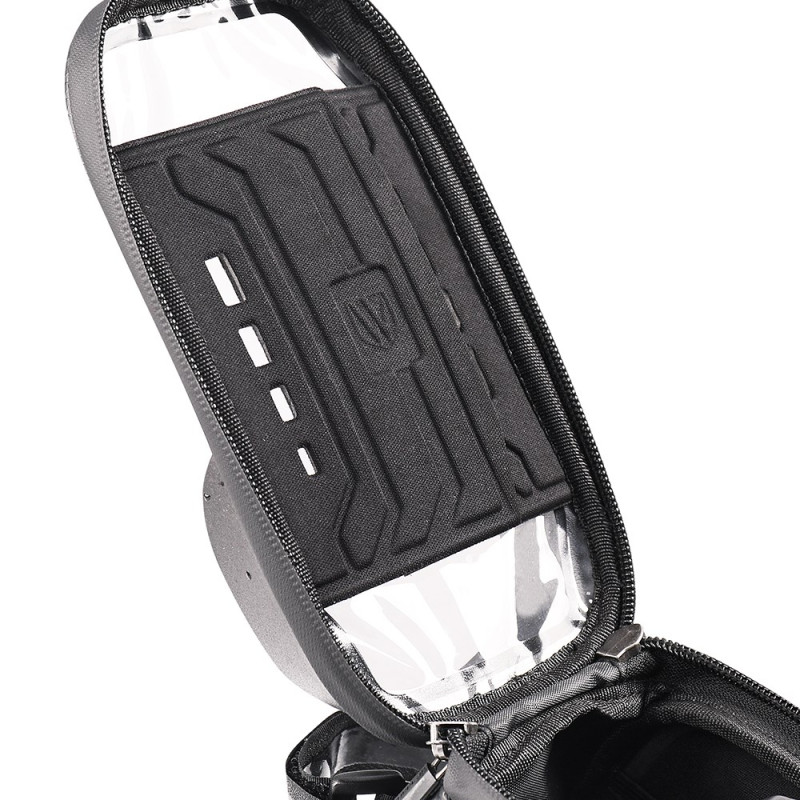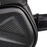De combinatie van een moderne 'koolstofvezel' esthetiek met impactbescherming is de belofte van deze frametas. De stevige EVA buitenkant beschermt je apparaten tegen stoten, terwijl de koolstofvezel coating de tas een verfijnde stijl geeft. De waterdichtheid wordt verbeterd door een waterbestendige ritssluiting. De geïntegreerde reflecterende strip verhoogt de passieve veiligheid 's nachts. De zonneklep verbetert de zichtbaarheid van het touchscreen (tot 7 inch) in direct zonlicht. Hij is snel te installeren, zonder gereedschap.