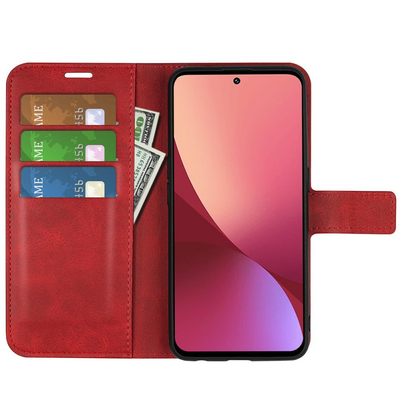 De hoes met lederen textuur is de ideale bescherming voor de Xiaomi 12 Pro en doet tegelijkertijd dienst als portemonnee en standaard.