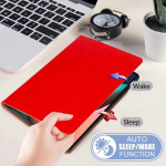 De hoes dient ook als handsfree houder en heeft een praktische band om de tablet met één hand te gebruiken.