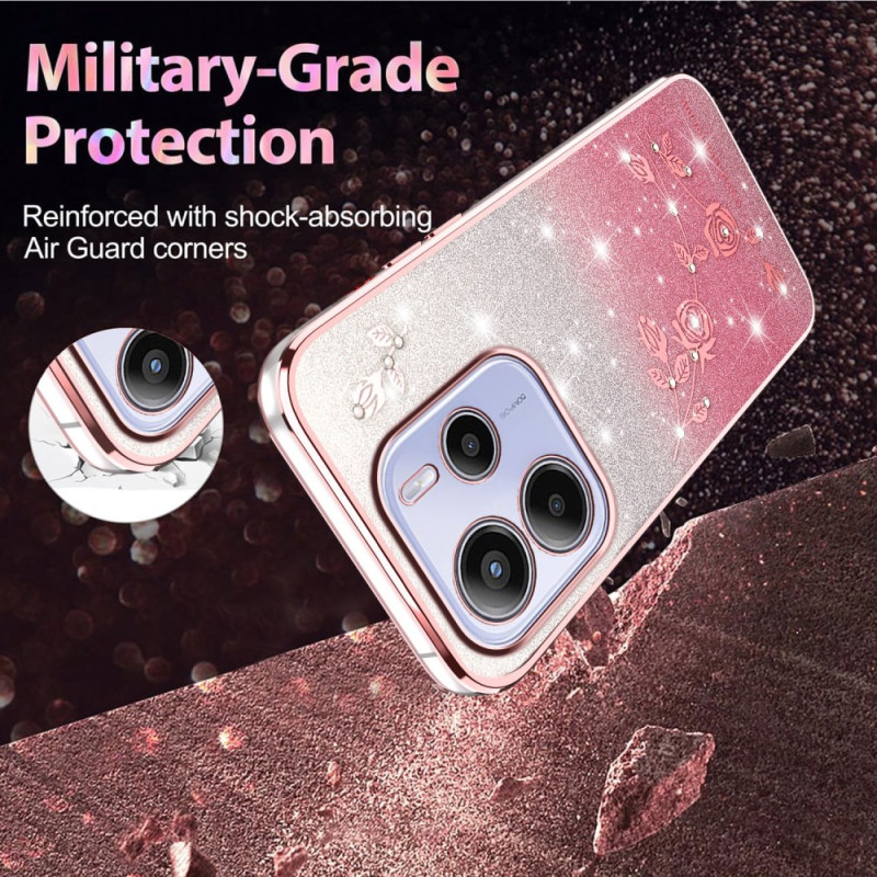 Ontdek ons elegante hoesje voor de Xiaomi Redmi Note 14 4G. Met zijn bloemendessin en glittergradiënt biedt hij een unieke en glamoureuze stijl.