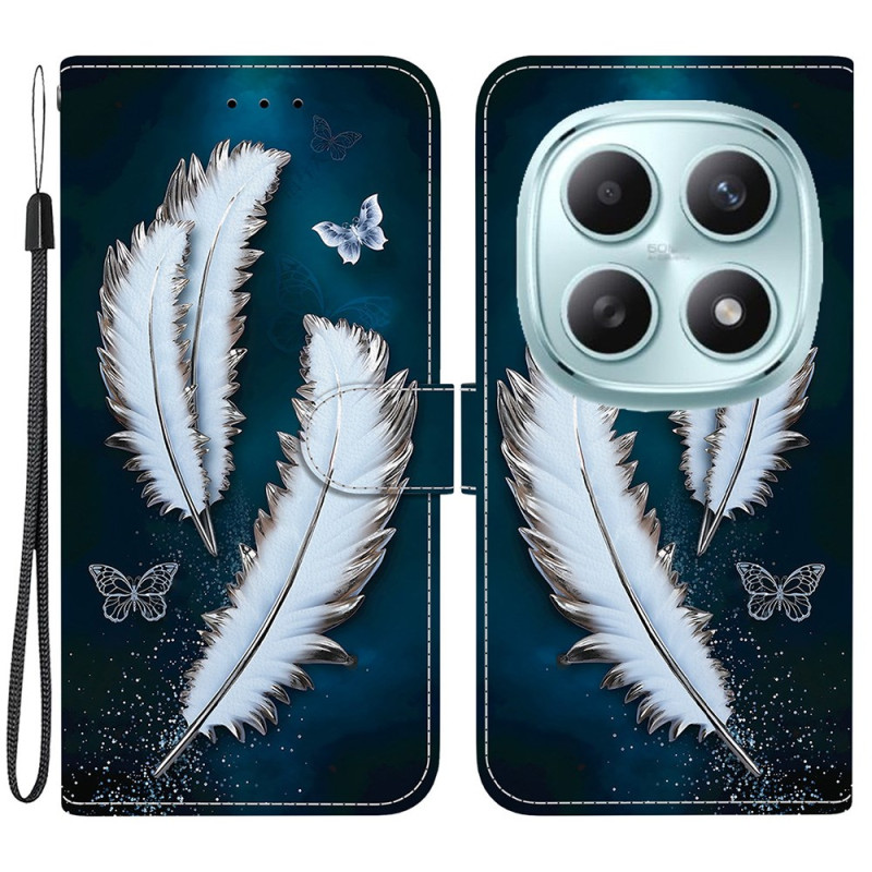 Bescherm je Xiaomi Redmi Note 15 5G in stijl met deze flap wallet case met een wit vlinderverenpatroon. Met een standaardfunctie, kaartsleuven, een veilige magneetsluiting en een verwijderbaar koord voor handig dragen.