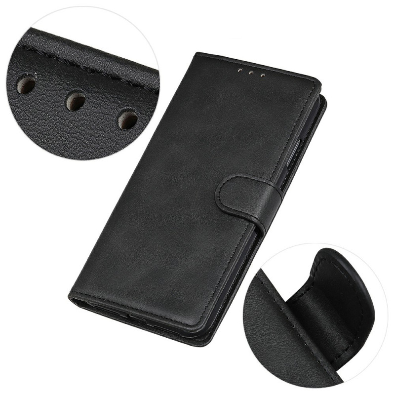Stijlvolle rundleren hoes met robuuste TPU buitenkant. Voorzien van 3 kaartsleuven, geldvakje aan de zijkant, dubbelzijdige magnetische sluiting en geïntegreerde standaardfunctie voor handsfree kijken.