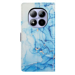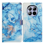 Elegante portemonnee hoes van kunstleer met blauw marmerpatroon voor de Xiaomi Redmi Note 15 Pro 5G. Alles-in-één ontwerp met 2 kaartsleuven, 1 fotovak en notitievak. Geïntegreerde opvouwbare standaard voor handsfree kijken en afneembare handriem inbegrepen.