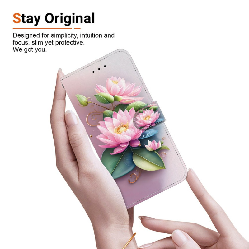 Elegant portemonnee hoesje voor Xiaomi Redmi Note 15 Pro 5G met verfijnde lotusprint. Met kaartsleuven, geïntegreerde houder en veilige magneetsluiting. Optimale stootbescherming met antikrasoppervlak.