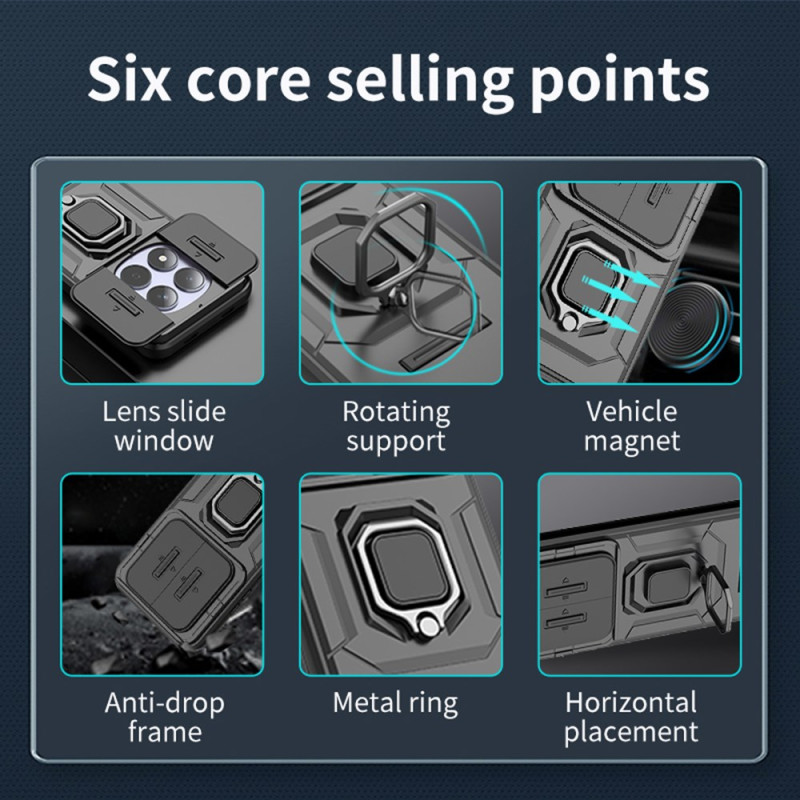 Bescherm je Xiaomi Redmi Note 15 Pro 5G met deze robuuste hoes met verschuifbare lenskap en roterende kickstand. Het is gemaakt van slijtvaste materialen en biedt optimale bescherming tegen stoten en krassen, terwijl alle functies van je telefoon volledig toegankelijk blijven.