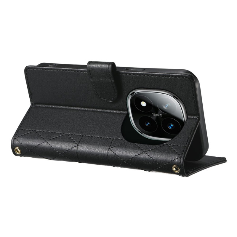 Stijlvolle PU lederen portemonnee hoes met diamant gewatteerd ontwerp voor Xiaomi Redmi Note 15 Pro Plus 5G. Voorzien van 3 kaartsleuven, 1 geldvak, geïntegreerde standaardfunctie en afneembare schouderbanden (kort en lang) voor veelzijdig gebruik.